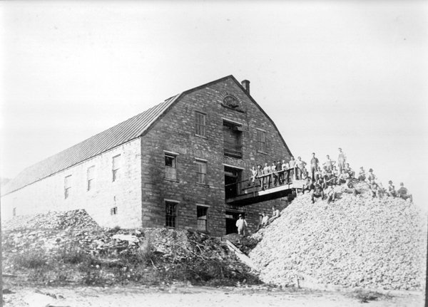 When it became a button factory, workers gathered there each day, turning loads of river shells into finished goods that were shipped far beyond Guttenberg. At its peak, the plant employed dozens, sometimes more than a hundred and ran multiple shifts. Workers would have arrived early, many of them local residents, stepping into long days of repetitive but skilled labor. It wasn’t glamorous work, but it was steady work. For a time, it connected Guttenberg to a much larger world, as finished buttons made their way far beyond the Mississippi River. Photographs from the time show rows of workers standing outside the building, men in work clothes, gathered shoulder to shoulder. By the 1930s, as economic conditions tightened, Empire had become the last button factory still operating in Guttenberg.